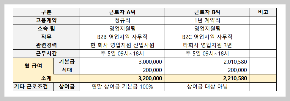 (주)OOO에는 영업지원 사무직으로 정규직 근로자 A 씨와 비정규직 근로자 B 씨가 근무하고 있습니다.