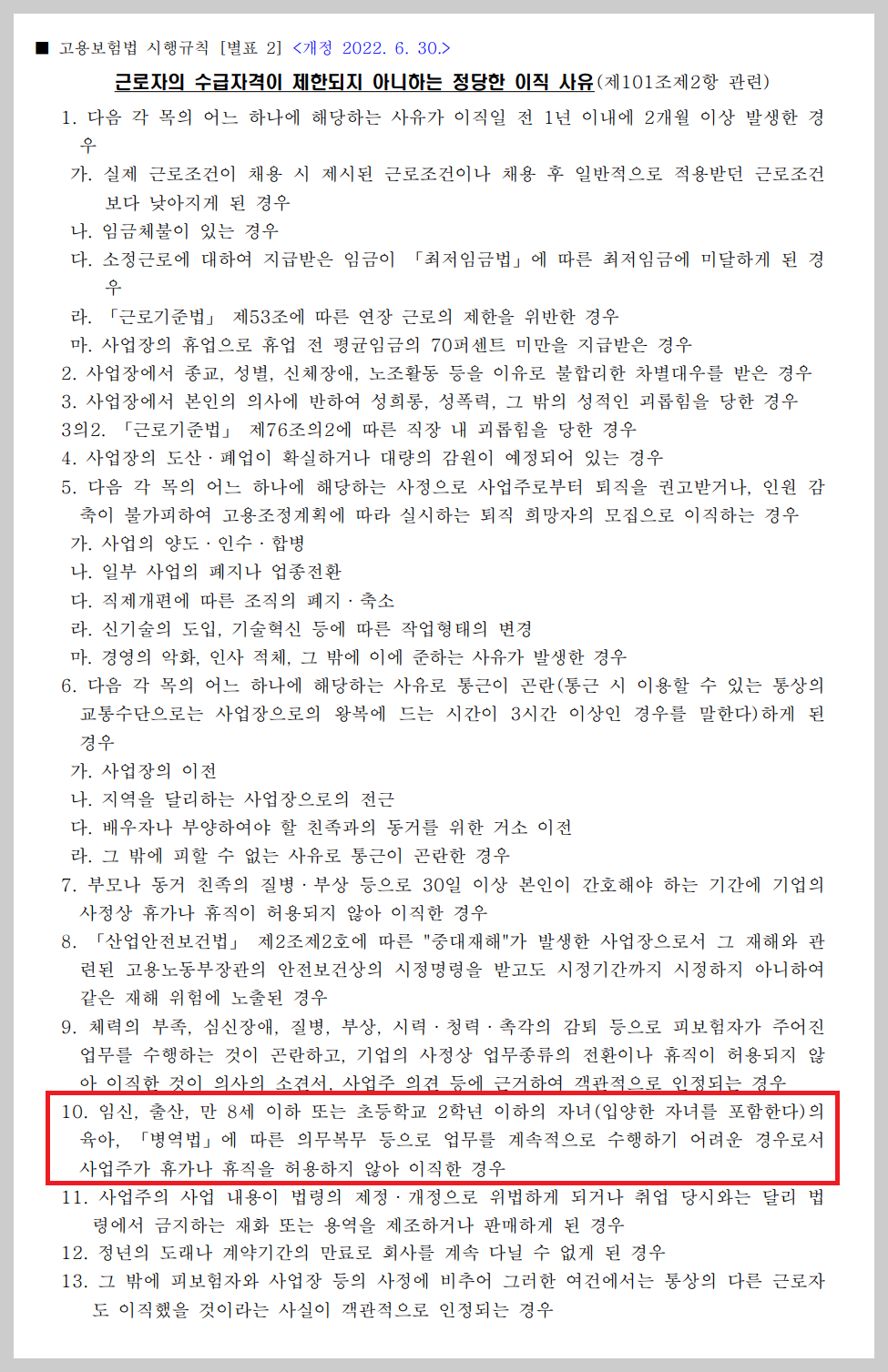 | 1. 임신, 출산, 만 8세 이하 또는 초등학교 2학년 이하의 자녀의 양육 중인 근로자로서 육아의 사유로 퇴사한 경우 2. 육아와 함께 업무를 수행하기 어려워 퇴사한 경우 3. 회사에 직무전환 배치, 근로시간 단축, 추가 무급휴직 등을 요청하였으나 회사에서 불가능해 퇴사한 경우 1~3 모두 충족되어야 육아로인한 퇴사로 실업급여를 받을 수 있는 자격이 예외적으로 인정됩니다. |