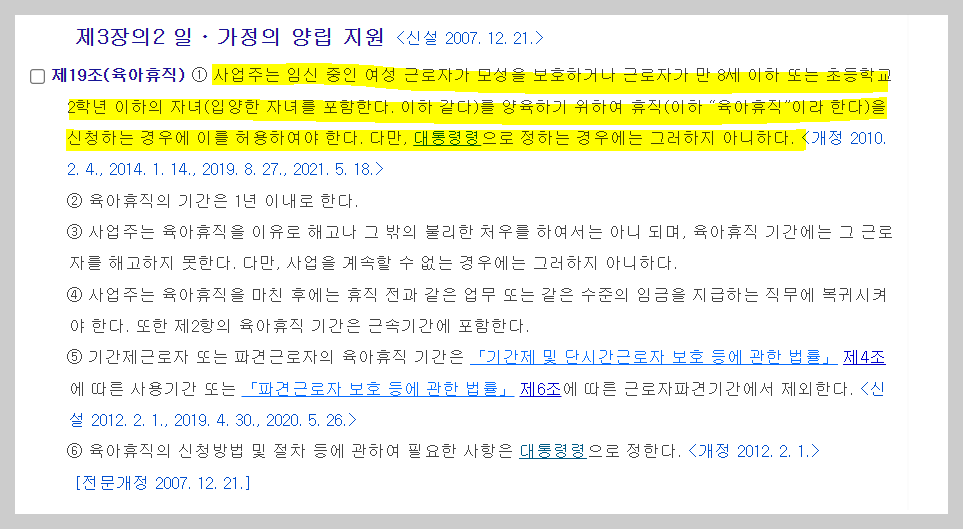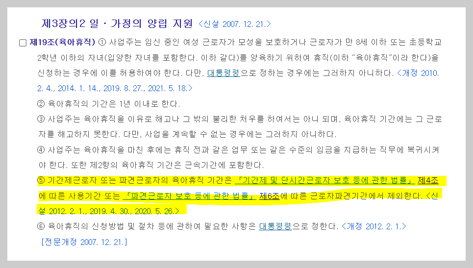 아마도 많은 실무자들이 이 부분을 헷갈려하는 것이, 남녀고용평등법 제19조 5항의 내용 때문에 실무적 오류가 발생한다고 생각합니다. 이 조항의 내용은 아래와 같습니다.