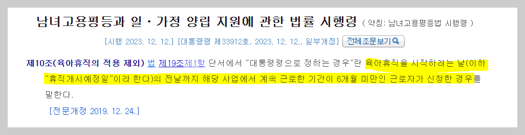 상기 19조 1항에 따르면, 육아휴직은 만 8세 이하 또는 초등학교 2학년 이하의 자녀를 양육하기 위하여 휴직을 신청하는 직원에 대해 허용해야 하지만, "대통령령"으로 정하는 경우에는 허용하지 않아도 된다라고 말하고 있습니다. "대통령령"으로 정하는 경우는 남녀고용평등법 시행령에 정하는 바로 아래와 같습니다.