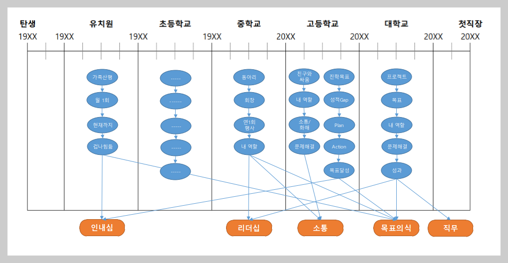 아래 내용은 제가 취업 준비를 하고 있는 학생들에게 많이 Advice하는 내용 중의 하나로, 나를 돌아보고, 자기소개를 쓰거나 직무와의 연관된 나의 경험을 Matching 해보기 위해 인생을 돌아보는 과정으로 활용하고 있는 내용입니다. 내 인생 주기별로 나열해 보고, 그 과정에서 있었던 사소한 기억들을 되돌아보면서 그 경험에서 발견할 수 있는 나의 Keyword를 찾고, 내가 하고자 하는 직무, 그리고 인생에서의 목표를 연관시켜 보는 일입니다. 여러분들께서도 한번 해보시기 바랍니다.