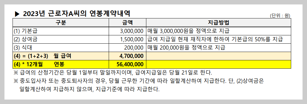 근로자 A씨의 경우, 상기 연봉계약에 따라 급여지급일이 21일이기 때문에, 퇴사일을 당월 21일 이후로 해야 급여에 불이익을 받지 않습니다. 그 이유는 상여금의 지급 기준이 "지급일 현재 재직자"에 한하여 지급하기로 하였기 때문에, 21일 전에 퇴사를 한다면, 정기상여금 전체를 지급받지 못하게 됩니다.