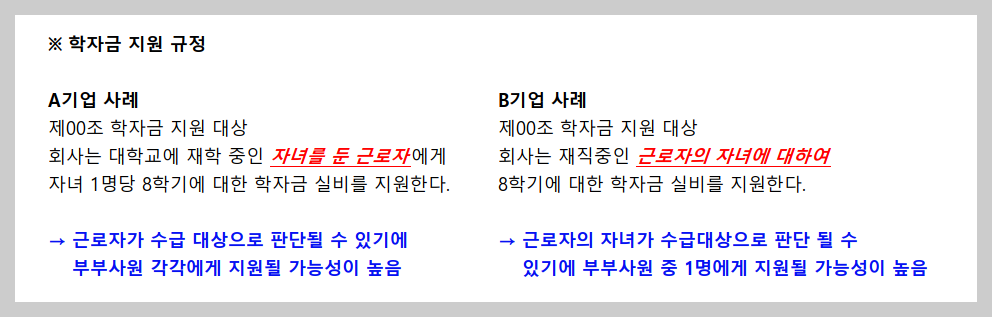 또한 학자금의 성격이 실비가 아닌 경조금의 성격으로 정해진 금액을 지급하는 경우보다 자녀의 학자금에 대해 실제 납부한 학자금 영수증을 증빙으로 실비를 지급하는 경우가 자녀에 대한 학자금 실비로 인정하는 회사들이 많기에 부부가 아닌 자녀의 학자금 실비로 부부 중 한 사람에게 지급하는 경우가 많습니다.