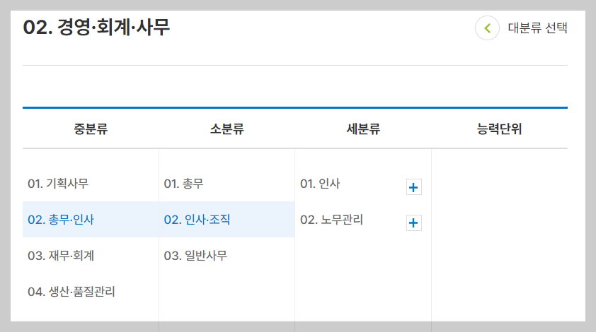 NCS 홈페이지를 방문하면 직무의 분야별, 키워드를 통해 직무를 검색할 수 있습니다. 제가 수행하고 있는 인사직무는 02. 경영.회계.사무 분야로 구분되어 있습니다. 찾아보도록 하겠습니다.